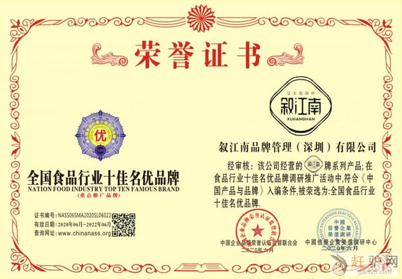 近日,叙江南品牌旗下系列产品在食品行业十佳名优品牌调研推广活动中,符合《中国产品与品牌》入编条件,被中国企业品牌荣誉认证监督联合会和中国信誉企业荣选调研中心荣选为“全国食品行业十佳名优品牌”g+a+n+l+v+5+c+o+m。